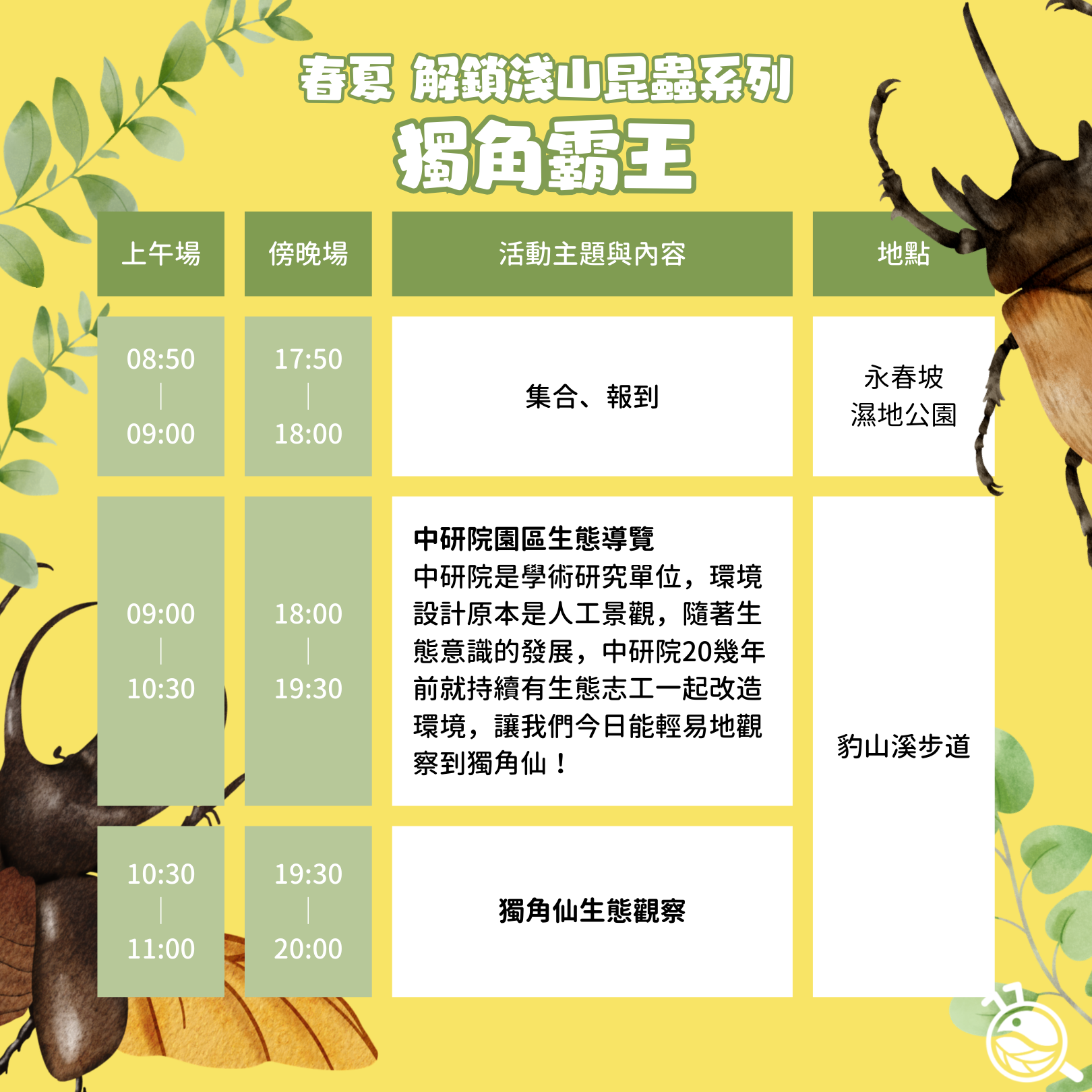 牠們有短短的一個月,忙著吃、打架、約會,在光臘樹上好不熱鬧!為什麼在平地都會區的地方看得到應該比較山區的獨角仙呢?滿是大型建物的中研院做了甚麼呢?讓我們一起去看看吧!